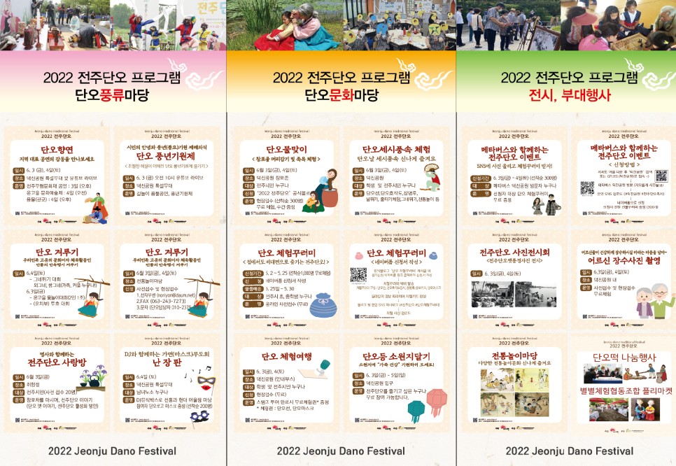 3일과 4일 이틀간 진행되는 2022 전주단오 행사는 단오 길놀이 공연과 전주시민의 안녕과 풍년을 기원하는 제례식인 단오 풍년기원제를 시작으로 단오문화마당과 단오 풍류마당, 전통놀이마당, 단오난장, 부대행사 등 여러 개의 풍성한 프로그램이 준비됐다.