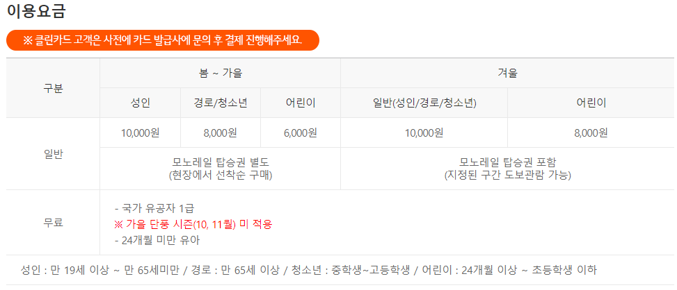 ① 일반(봄~가을): 성인 10,000원, 경로/청소년 8,000원, 어린이 6,000원, 모노레일 탑승권 별도(현장에서 선착순 구매)