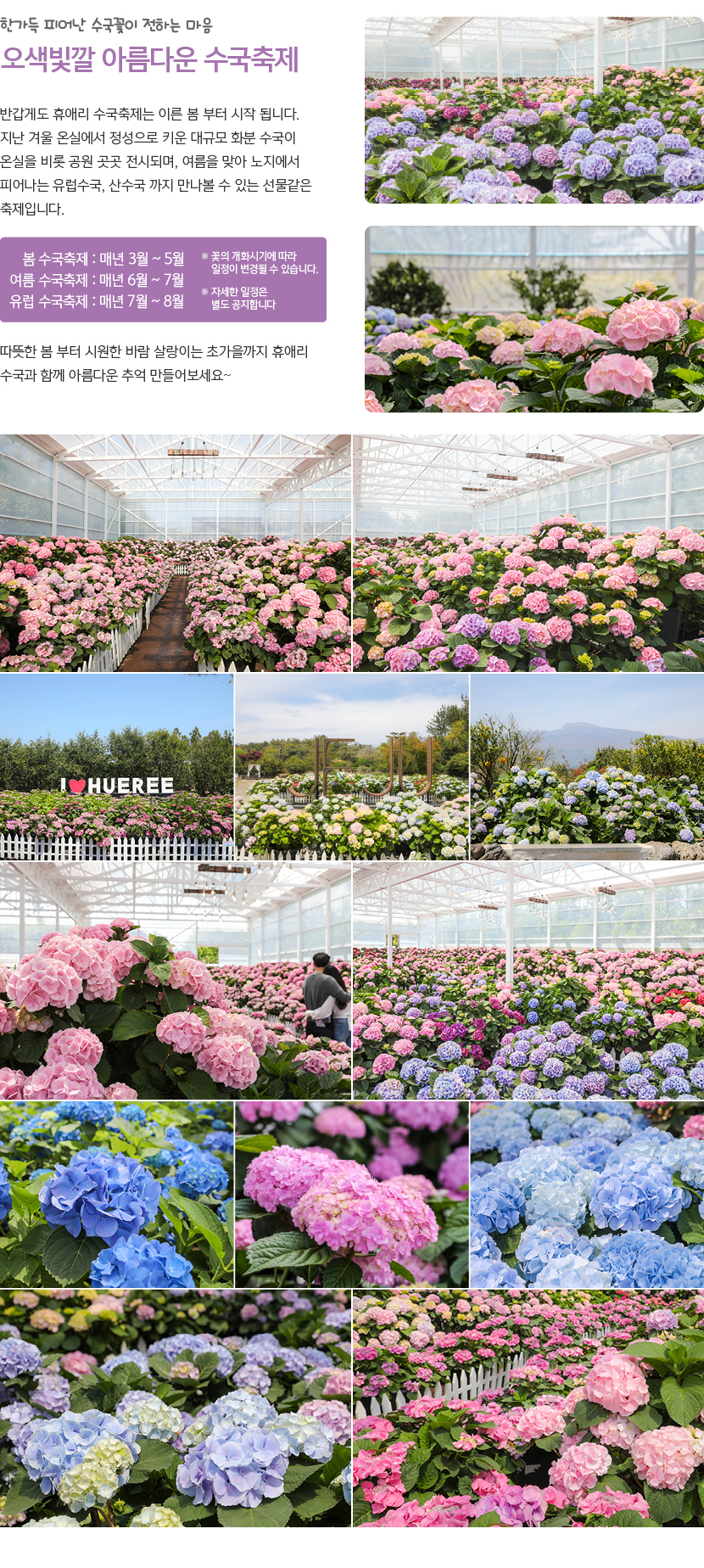 휴애리 여름 수국 축제는 정성스럽게 키운 다양한 수국을 온실, 수국 정원, 수국 오름 등 공원 곳곳에서 감상할 수 있어 제주도민과 관광객에게 인기가 좋은 제주 대표 축제다. 특별히 온실에서 다양한 수국을 만나 볼 수 있으며 공원 첫 입구부터 나오는 출구까지 전체가 수국으로 덮여있는 풍경을 자랑한다.