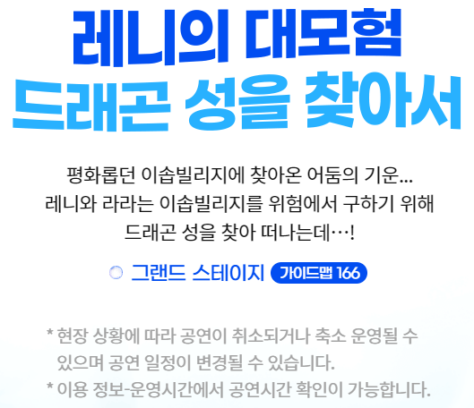 * 현장 상황 및 기상 예보에 따라 공연이 취소되거나 축소 운영될 수 있으며 공연 일정이 변경될 수 있습니다. 이용정보-운영시간에서 공연시간 확인이 가능합니다. 본 공연 관람시 물에 젖을 수 있습니다.