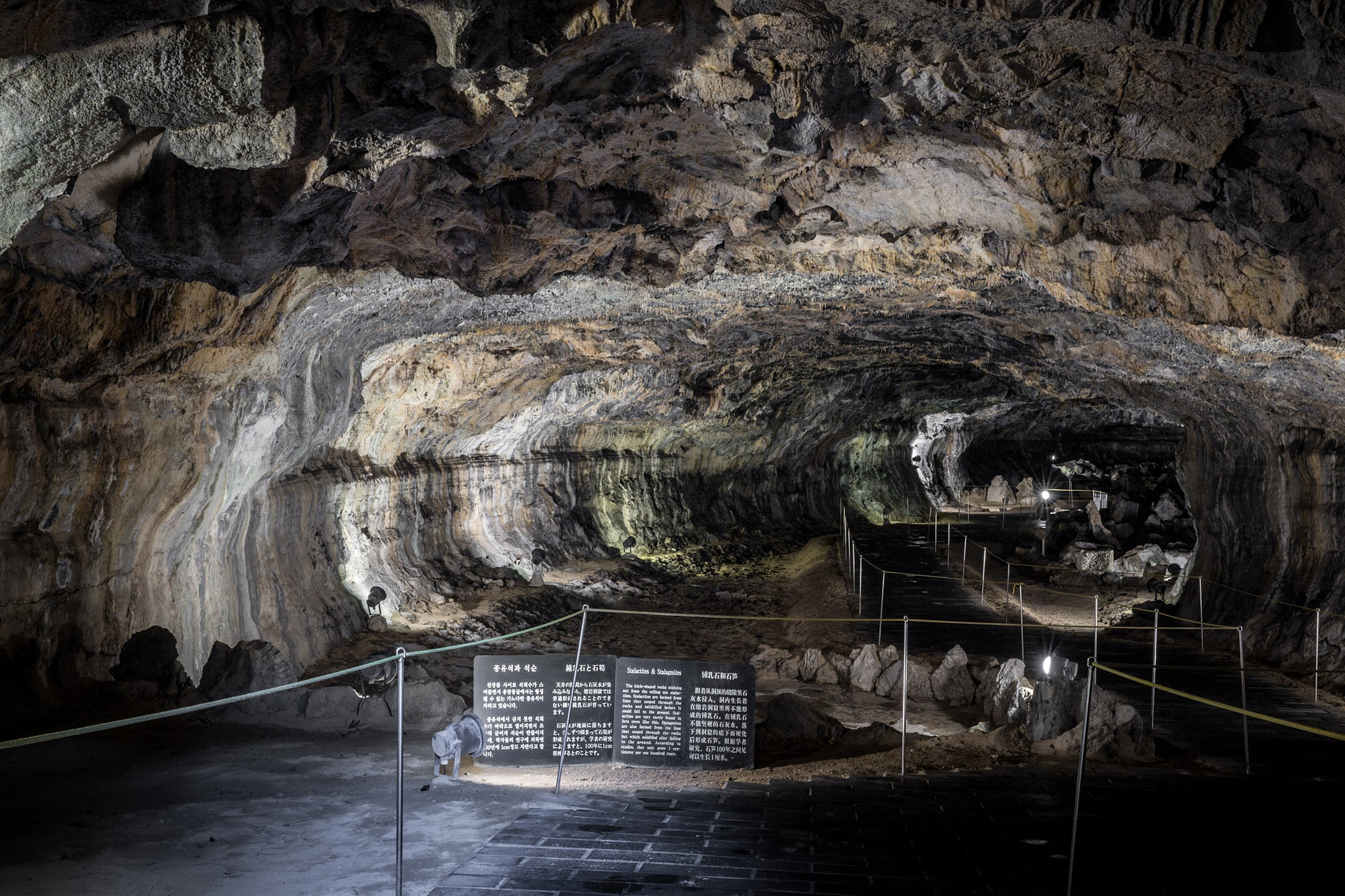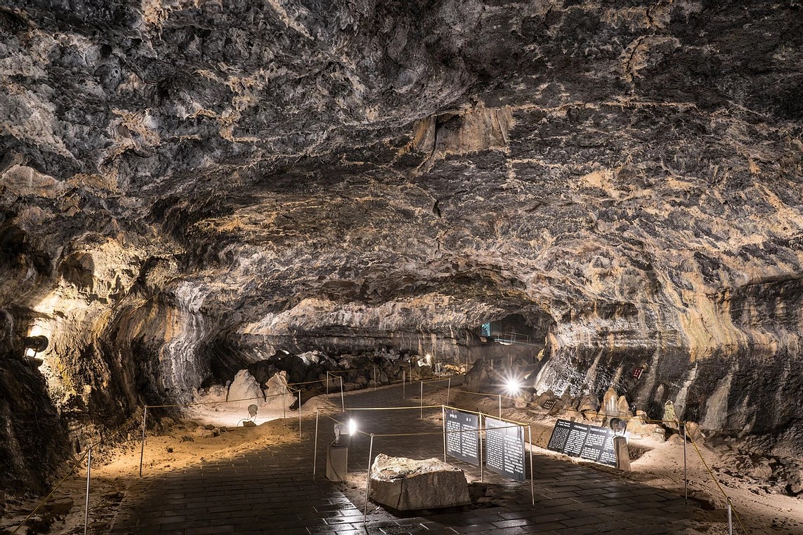 한라산 화산이 폭발하면서 용암이 흘러내려 형성된 검은색 용암동굴의 천장과 벽면으로 스며드는 석회수로 인하여 황금빛 석회동굴로 변해가는 2차원적 복합 동굴이다.