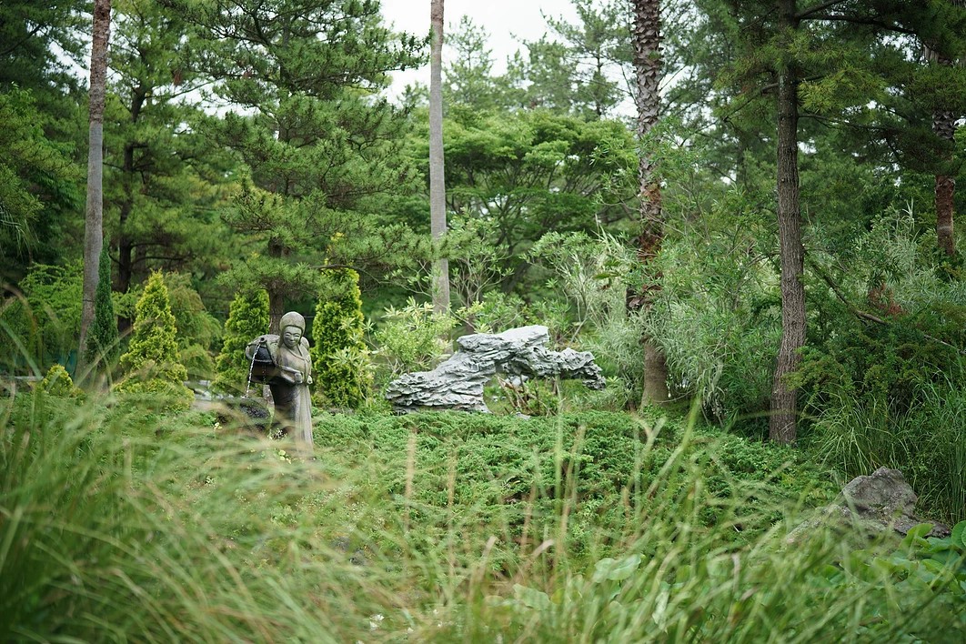 산야초원 입구 양쪽으로 다양한 표정을 하고 있는 제주도 돌하르방을 따라가면 사시사철 피어나는 아름다운 야생화와 제주 특산식물, 그리고 생태연못이 어우러진 호젓한 오솔길을 만날 수 있다.