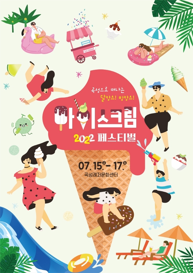 - 2022 곡성 아이스크림 페스티벌은 먹거리(아이스크림,맥주,멜론 등), 아이스크림 만들기 등 체험부스, 물놀이(워터슬라이드, 버블슬라이드, 물총싸움, 풀장)를 즐기실 수 있습니다.