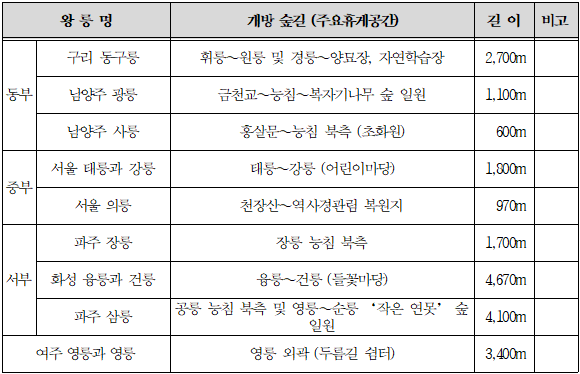 궁능유적본부는 도심에서 가까운 곳에 위치하면서 ‘신의 정원’이라 불릴 만큼 울창한 왕릉 숲길을 국민에게 돌려주기 위해 향후 더 많은 숲길을 체계적으로 조성·정비하여 개방할 계획이다.