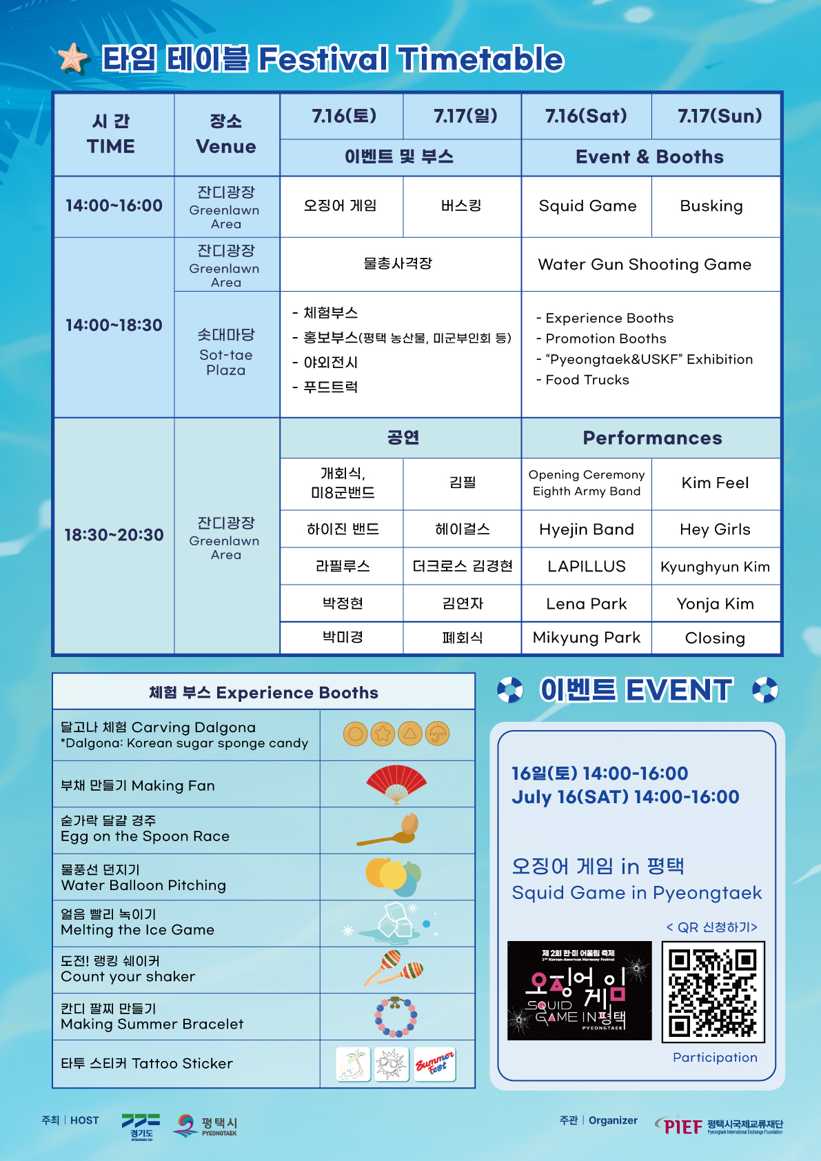 여름 테마 포토존, 물총 사격 ZONE, 물풍선 던지기 등 체험부스가 운영되며 17일에는 김연자, 김필 등이 무대를 빛낸다.
