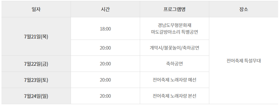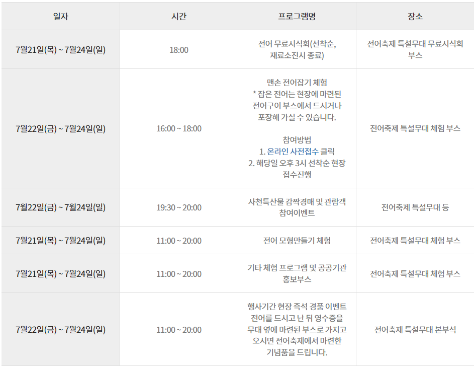 - 여름 햇전어 판매, 풍물장터, 맨손전어잡기 체험 등을 비롯한 체험 프로그램