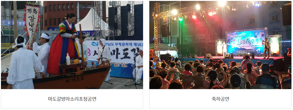 - 경남무형문화재 마도갈방아소리 초청공연, 전어축제 노래자랑, 전어 무료시식회, 축하공연 및 불꽃놀이, 찾아가는 사천 특산물 깜짝 경매 및 관람객 이벤트 등