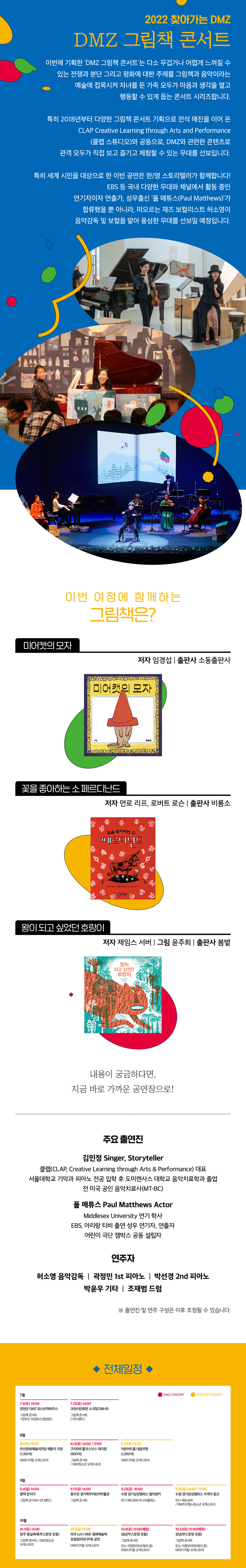 ※ 예정작품 : 〈미어캣의 모자〉소동출판사,〈왕이 되고 싶었던 호랑이〉도서출판 봄볕 - 출 연 진 : DMZ 그림책 콘서트(김민정, 폴 매튜스 외 재즈밴드 5인)