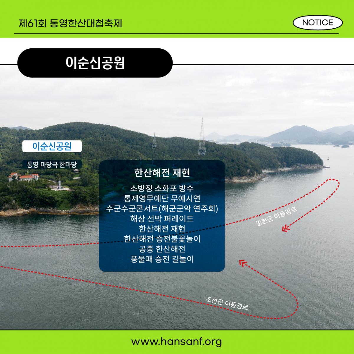 엘리자베스 키스의 ‘푸른 옷을 입은 조선무인’역사홍보관(통제영거리) 18:30 찾아가는 통영한산대첩축제(한산도) 한산면(진두물량장) 18:30 국가무형문화재 승전무 공연 산양읍 통영 당포성 19:00 한산해전 출정식 산양읍 통영 당포성 20:00 통영한산대첩축제 61주년 축하공연 ‘통제영의 밤’ 통영 삼도수군통제영 특설무대 8. 13.(토) 15:00 영화 ‘한산:용의 출현’ 김한민 감독 초청강연 역사홍보관 시청각실 <한산대첩 재현> 17:45 통영 소방서 소방정 소화포 방수 이순신공원 18:0017:55 통제영무예단 무예시연 이순신공원 18:00 수군수군콘서트(해군군악 연주회) 이순신공원 18:00 해상 선박 퍼레이드 이순신공원 18:50 한산해전 재현 이순신공원 19:20 한산해전 승전불꽃놀이 이순신공원 19:30 공중 한산해전 이순신공원 20:00 풍물패 승전 길놀이 이순신공원 8. 14.(일) 18:30 국가무형문화재 통영오광대 공연 무전대로 특설무대 19:30 삼도수군통제사 이순신 장군행렬 및 무전대로 버블 코스프레 거리퍼레이드 무전대로 (해군의장대 시연 및 해군군악대 공연, 통제영 프리마켓, 이순신 장군 해전승리 및 통제영 병영 체험마당, 어린이 물놀이장, 공중한산해전, 추억의 뮤직 DJ BOX 및 푸드트럭존) 무전대로 19:30 1318!!, 통영의 꿈(청소년댄싱공연) 무전대로 특설무대 21:00 시민대동제 및 한산대첩 430주년 승전축하주막 무전대로 7. 29.(금)