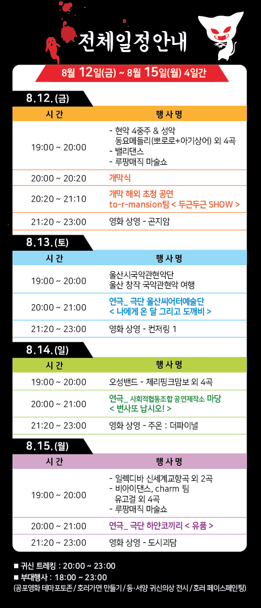 울산연극협회 홈페이지에서 사전예매로 진행되고 있는 납량축제는 각 회차당 200명씩 모집하고 있으나 각 요일별 주요 인기 시간대는 이미 전석 매진되었다.